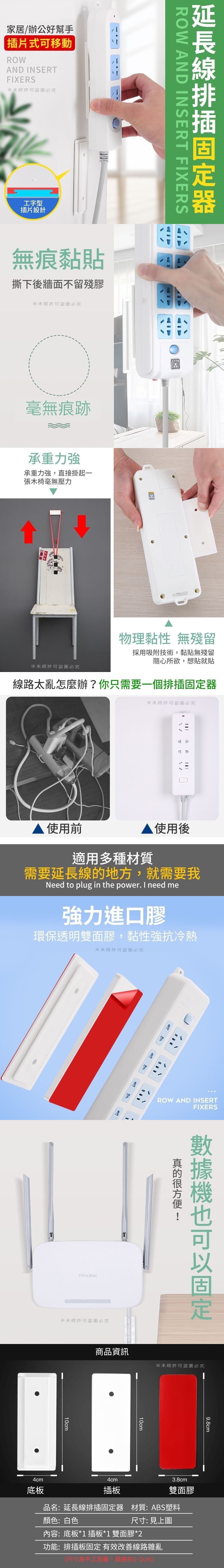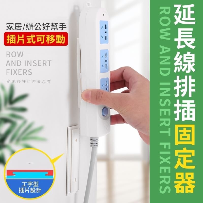 延長線排插固定器 台灣零批:35元 家居辦公好幫手,用電更隨心 ,牆面插片是固定器可移動, 可自由移動取下插排,方便實 用,承重力強、無痕黏貼、也 可固定數據機等各種物品,一 物多用,告別凌亂~