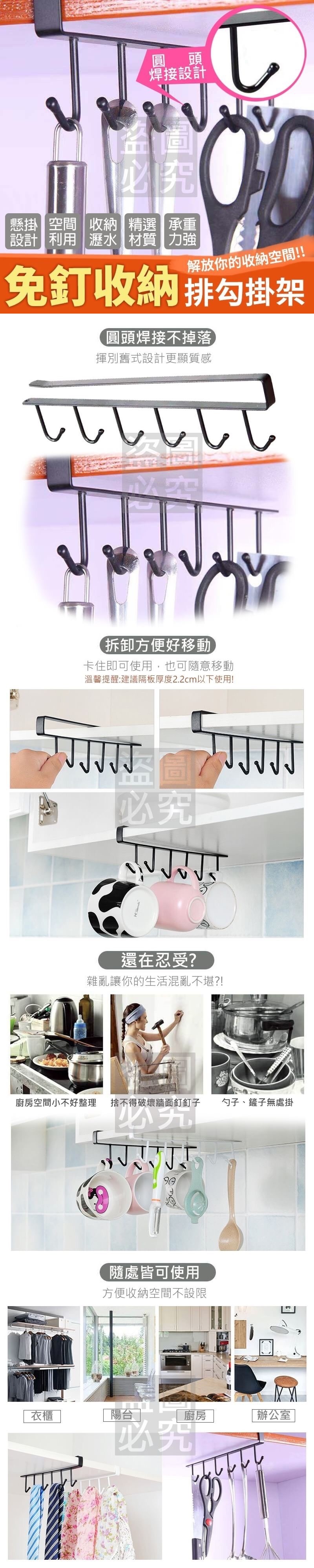 免釘收納排勾掛架 台灣零批:25元 免釘免黏~真的嗎? 真的~ㄇ字型卡上去即可用~ 挖掘櫥櫃夾板下方的新空間~(灑花 圓頭焊接不會掉更顯質感~ 重點是不限制使用空間~ 不論臥室、辦公室、廚房、廁所 只要木櫃夾板不超過2.2cm即可使用! 特選材質讓承重經得起考驗! 掛馬克杯也鼻用怕啦~~