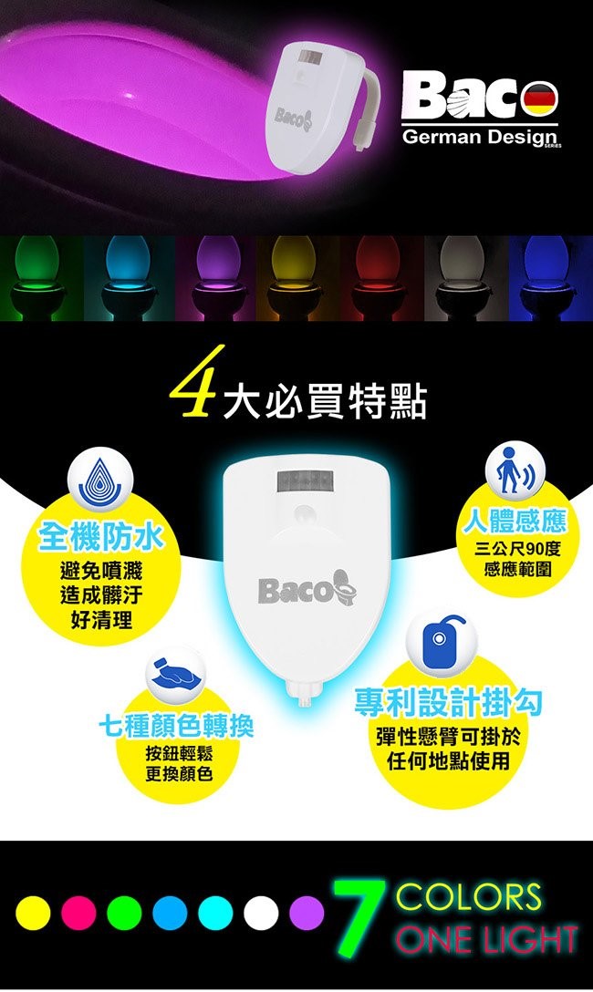 BACO德國LED七彩自動感應燈 切貨:45元、只有1200個 夜晚自動感應照明 避免開燈刺眼 不用摸黑找電源 不干擾他人睡眠 內置防水LED感應燈 可變換7種顏色 感應距離最遠可達3公尺 特殊懸掛設計 可隨意掛置照明 電源:3號電池*3 商品規格:6.8*9.5*1.8cm 商品材質:PVC+ABS