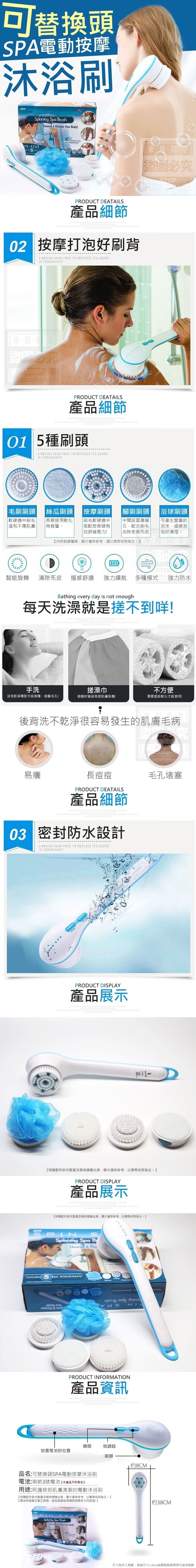 可替換頭SPA電動按摩沐浴 台灣零批:155元 【商品尺寸】- 38x8cm (尺寸為手工測量,誤差尺寸±2cm為國際驗貨標準可接受範圍) 【商品說明】- 嚕拉拉魯拉拉魯拉拉~ 人生最~享受的事就是洗香香啦! 可是最痛苦的就是偶的背 搓、搓不到啦Q.Q... 這不4手短的問題 想不求人就看我拿出這支(小叮噹法寶配音 就是這支讓我不求人 刷頭還可依據需求替換呢! 也不怕碰水,防水可是處理過的呢! 按摩又打泡沫的沐浴刷 細緻泡泡更能深層清潔肌膚 背部按摩順便來 全身都可用~洗到哪用到哪