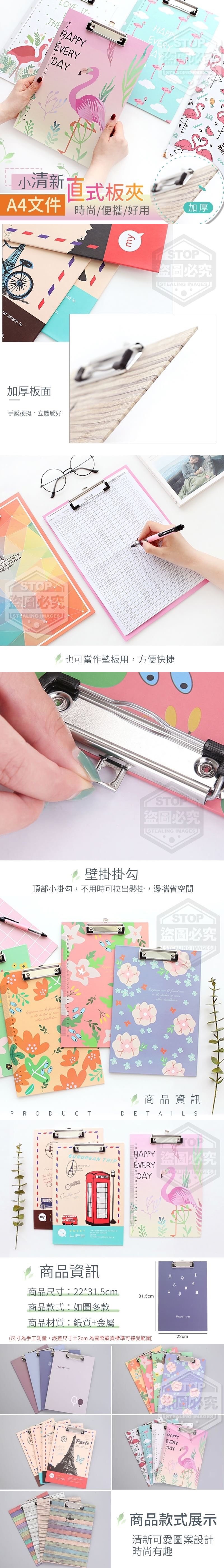 小清新A4文件直式板夾 隨機 批發:16元 一箱192個 【商品尺寸】22*31.5cm (尺寸為手工測量,誤差尺寸±2cm為國際驗貨標準可接受範圍) 【商品材質】-紙質+金屬 【商品說明】- A4文件直式板夾,金屬板扣、牢固扣押、 使用方便不易脫落,壁掛掛勾設計,不用 時可拉出懸掛,節省空間,加厚板面,手 感立挺,立體感好,更加耐用,清新可愛 圖案設計,時尚有趣~