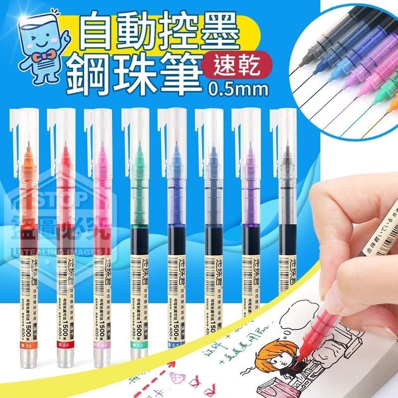 自動控墨鋼珠筆0.5mm(6色/盒) 台灣零批:一盒40元 【商品尺寸】14.3cm (尺寸為手工測量,誤差尺寸±2cm為國際驗貨標準可接受範圍) 【商品說明】-6色混/盒 自控墨設計,內置精密出墨調節 器,使供墨穩定順暢,鰭片結構 ,使墨水流量穩定、防止斷墨和 漏墨,採用速乾墨水、即寫即乾 紙面不花,適用於手帳、筆記、 繪畫、寫作等,給你不一樣的書 寫體驗!