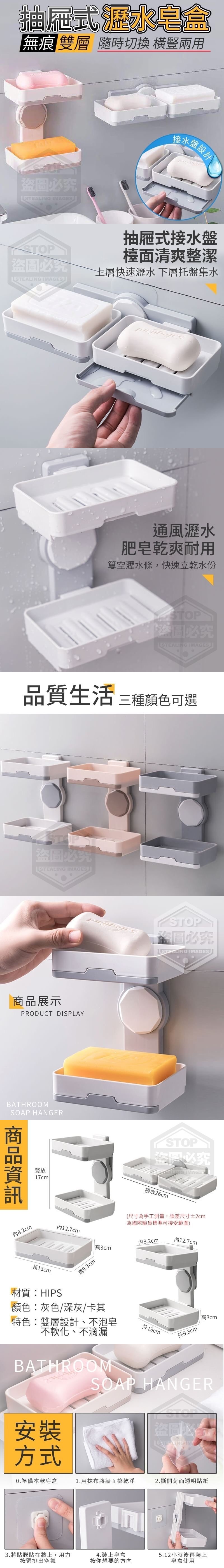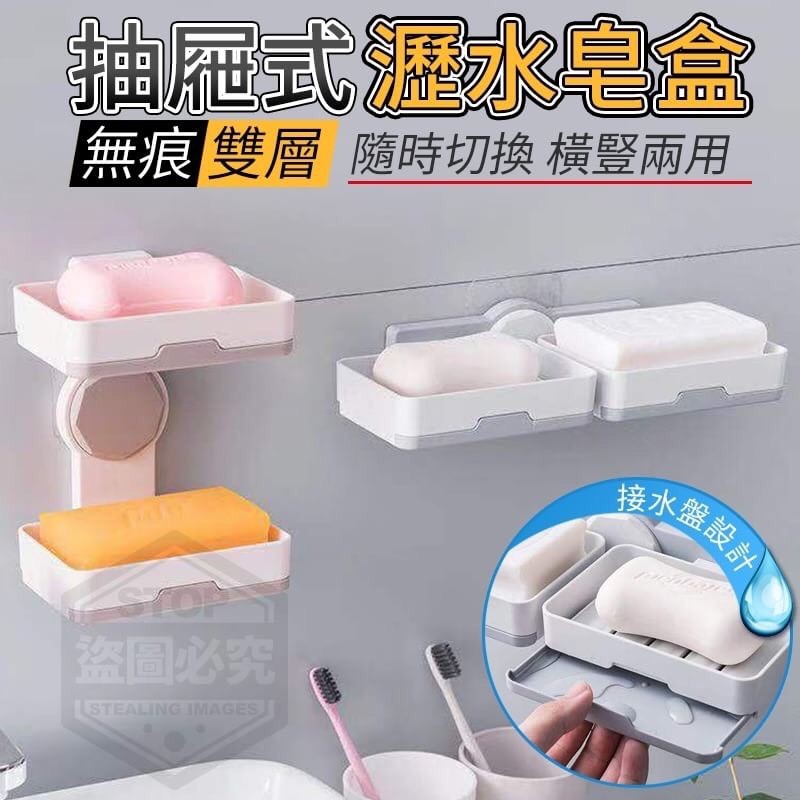 無痕雙層抽屜式瀝水皂盒 台灣批發:50元 【商品材質】-HIPS 【商品說明】- 抽屜式水盤,檯面清爽整潔 雙層設計,上層快速瀝水, 下層托盤集水,橫豎兩用隨 時切換,不泡皂、不軟化、 不滴漏,讓肥皂乾爽耐用!