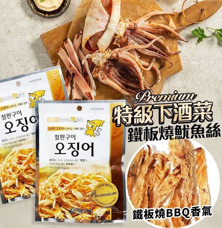 特級下酒菜鐵板燒魷魚18g 特批價:10包390元 韓國人看電影可不只是吉拿棒 爆米花 經典的代表零食就是"魷魚絲" 不要懷疑就是他 嚼了生香還多汁~除了是下酒菜No.1 追劇配電影當然也是No.1 帶著鐵板燒BBQ香的魷魚絲 每次吃都會瞬間完食!