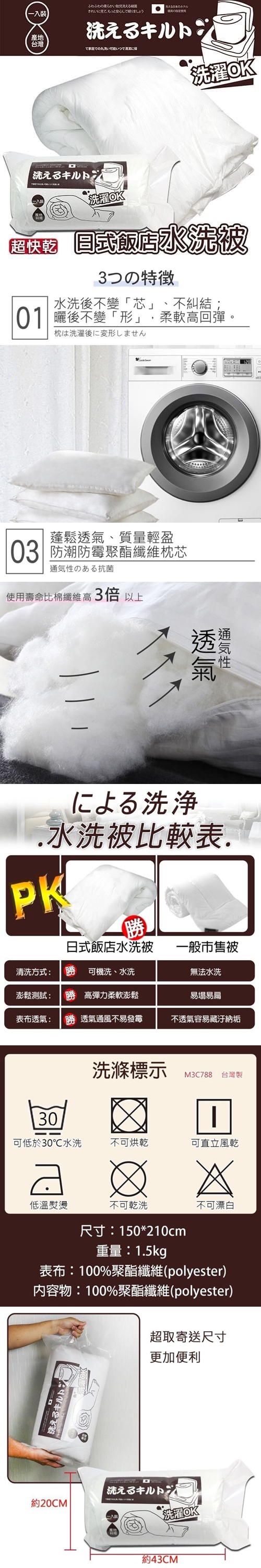 台灣製造 日式飯店水洗被1.5KG 魔神特批:430元 尺吋:150×210cm 表布:100%聚酯纖維 內容物:100%聚酯纖維 經典壓花可水洗, 不變形、不結塊, 洗後輕柔蓬鬆暖, 雙倍潔淨! 清洗後一樣維持『柔軟、舒適、好眠』 你需要一顆真正能水洗, 防止真菌滋長的﹝被芯﹞! 精緻走線, 耐牢不易開! 柔軟、高回彈, 經水洗、擠壓,也不變形~ 表層抑菌壓花,透氣細緻, 超好眠、超透氣!