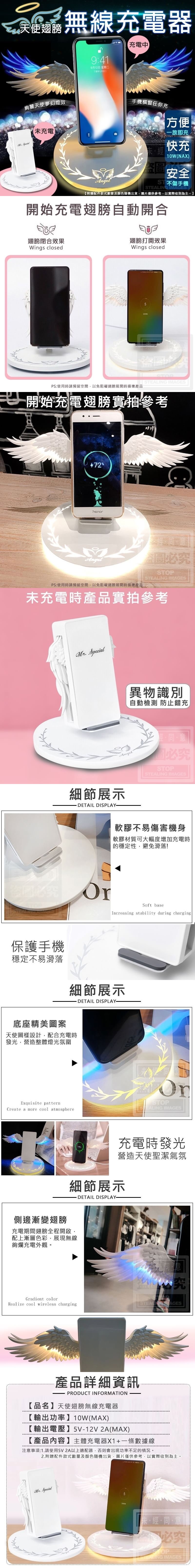 天使翅膀無線充電器 批發:295元 (附贈配件款式數量及顏色隨機出貨,圖片僅供參考,以實際收到為主。) 【輸出功率】-10W(MAX) 【輸出電壓】-5V-12V 2A(MAX) 【商品說明】- 無線充電器,高顏值點燃你的少女心~ 天使聖潔翅膀絢麗展開 側邊漸變夢幻燈效翅膀 軟膠材質不易傷機身穩定不易滑 底座發光透出精美天使翅膀圖騰 充電時展翅療癒你的時時刻刻~ 美到彷彿跟著天使展翅飛翔翱翔無邊天際。