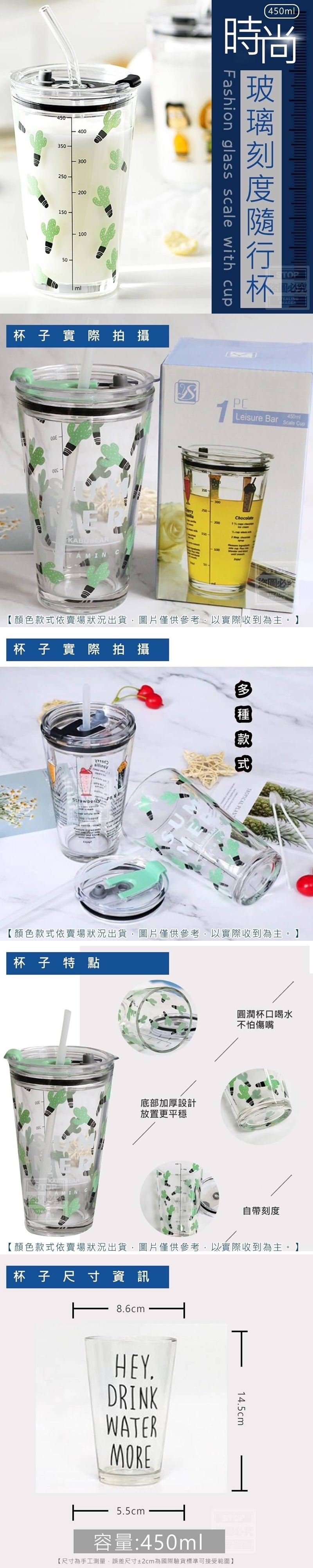 吸管 杯蓋都有附 【商品尺寸】-8.6x14.5x5.5cm (尺寸為手工測量,誤差尺寸±2cm 為國際驗貨標準可接受範圍) (附贈配件款式數量及顏色隨機出貨, 圖片僅供參考,以實際收到為主。) 【商品說明】- 時尚好看多款樣式時尚隨行杯~ 附帶刻度讓你知道喝多少! 一目了然精準控制! 適合泡牛奶、泡可可粉...等飲品! 透明玻璃附帶吸管以及杯蓋! 杯蓋防止打翻!!放置桌上更安心! 隨心隨行攜帶超方便的好杯杯
