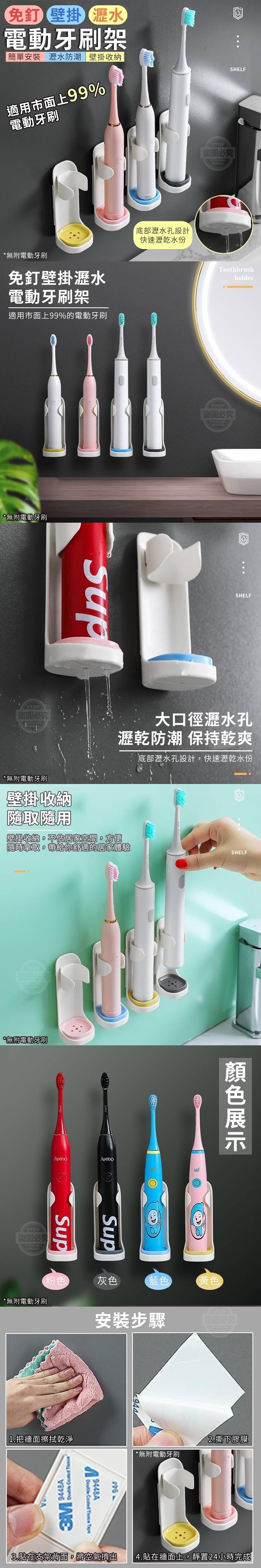 (附贈配件款式數量及顏色隨機出貨, 圖片僅供參考,以實際收到為主。) 【商品說明】- 這是一款門為電動牙刷而設計的牙刷架 適用市面上99%的電動牙刷 不用擔心不適合放不下的問題 底部大口徑瀝水孔設計 瀝水快乾,隨時都能保持乾爽 壁掛收納,隨取隨拿 拿取超方便,帶給你舒適的使用體驗 四種不同顏色,全家人各一個位置剛剛好 人同顏色也不怕家人拿錯!
