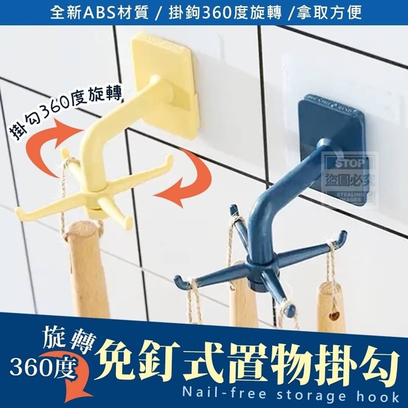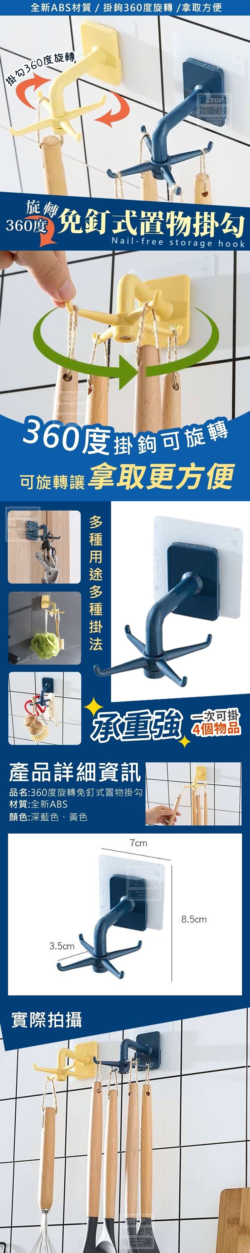 【商品尺寸】-整體尺寸7X8.5CM/ 單一掛鉤尺寸3.5CM (尺寸為手工測量,誤差尺寸±2cm 為國際驗貨標準可接受範圍) (附贈配件款式數量及顏色隨機出貨, 圖片僅供參考,以實際收到為主。) 【商品說明】- 360度可旋轉式設計掛勾 簡單安裝,好收納懸掛,不再雜亂 讓你一次可多掛多種物品 黏一次掛鉤擁有4個掛勾! 厚實質感採用全新ABS材質 優質承重讓你掛物更放心 低調簡約色系共兩色:深藍與黃色 讓收納也能成為一道風景唷 拓展更多收納空間