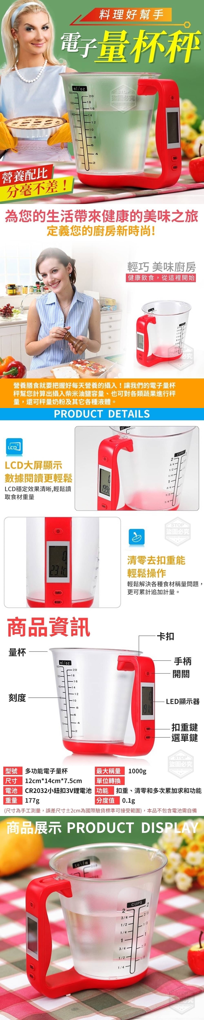 【商品尺寸】12*14*7.5cm (尺寸為手工測量,誤差尺寸±2cm 為國際驗貨標準可接受範圍) 【商品說明】- 營養膳食就要把握好每天營養的攝入! 讓我們的電子量杯秤幫您 計算出攝入柴米油鹽容量 也可對各類蔬果進行秤量 還可秤量奶粉及其它各種液體。 營養配比,就要分毫不差! 歸零、扣重、累加等多種功能 操作簡單,輕鬆解決各種食材稱量問題 為您的生活帶來健康的美味之旅 定義您的廚房新時尚! 健康飲食,從這裡開始~