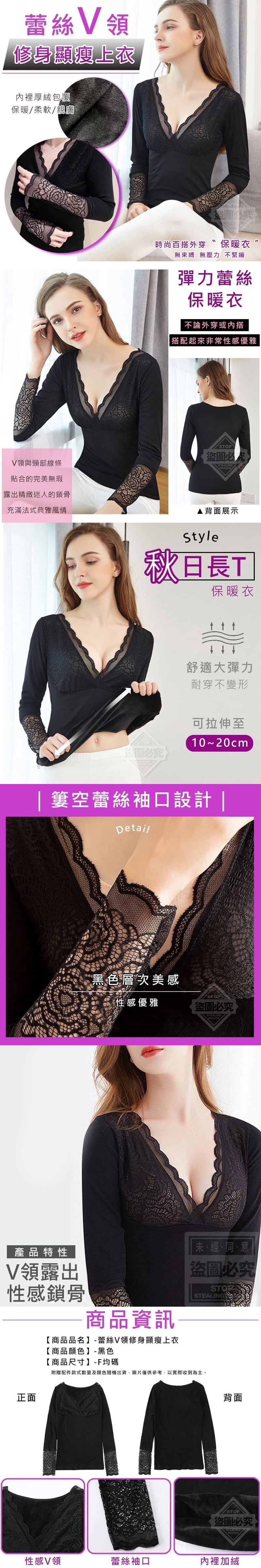 【商品顏色】-黑色 【商品尺寸】-F均碼 【商品說明】- 有彈力的蕾絲保暖衣 不論外穿或內搭 搭配起來非常性感優雅 實穿性很高 V領與頸部線條貼合的完美無瑕 露出精緻迷人的鎖骨 充滿法式典雅風情 整件穿起來剛剛好 不用擔心會虎背熊腰 非常修身顯瘦 合身但不貼身 展現凹凸有致的曼妙曲線 無束縛 無壓力 不緊繃 舒適時尚又百搭 內裡有厚絨包覆 保暖/柔軟/親膚