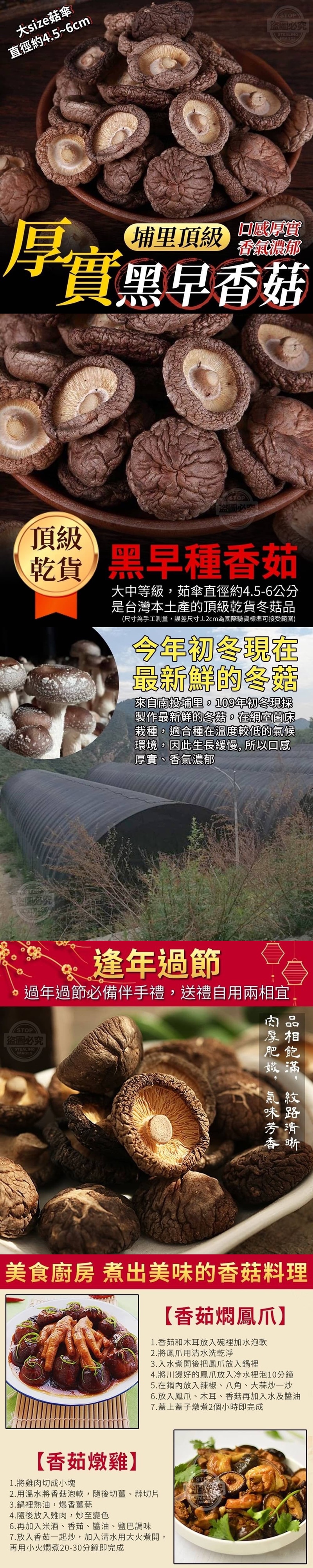【商品規格】- 重量:100公克 產地:臺灣 保存方式:常溫 【商品說明】- 來自好山好水的埔里 頂級厚實的黑早香菇 大中等級,菇傘直約4.5-6公分 是台灣本土產的頂級乾貨冬菇品種 是109年初冬現採製作而成的 最新鮮的冬菇喔! 在網室菌床栽種 適合種在溫度較低的氣候環境 因此生長較緩慢 因此花費較久時間生長的香菇 比一般的香菇口感還要厚實 且香氣更濃郁~ 品相飽滿、紋路清晰、肉厚肥嫩、氣味芳香 是過年過節必備伴手禮 不管是自己吃或是送親朋好友都很適合