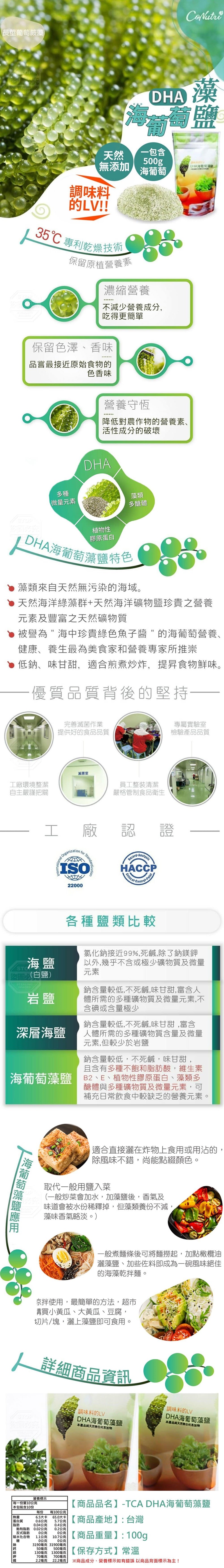 【商品規格】- 產地: 台灣 重量:100g 保存方式:常溫 【商品說明】- 台灣高品質農作 DHA海葡萄藻鹽 嚴選高品質農作保留食材風味營養 調味料界的LV/純天然無添加 藻類來自天然無污染的海域 讓你可攝取到天然豐富的礦物質 被譽為"海中珍貴綠色魚子醬" 健康養生最被美食家、營養學家所推崇 低鈉、味甘甜,適合煎煮炒作, 提升食物鮮味 讓你越吃越健康的美味~ 有了它為自己以及全家的健康把關!!