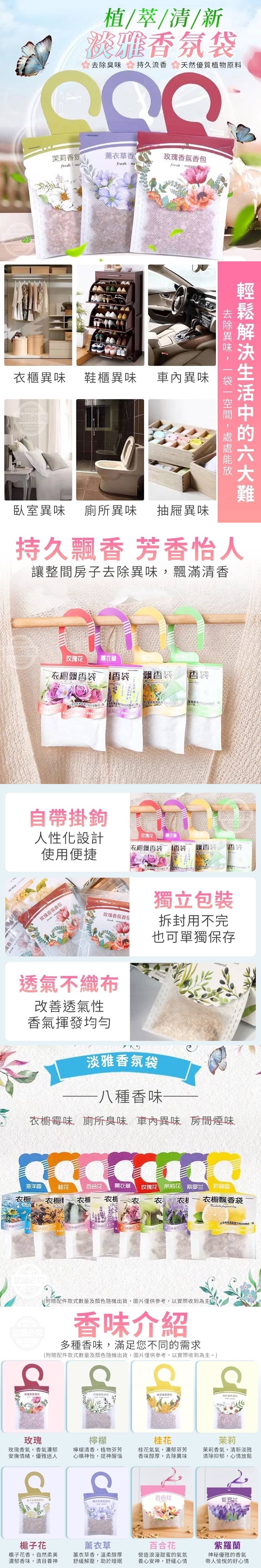 (附贈配件款式數量及顏色隨機出貨, 圖片僅供參考,以實際收到為主。) 【商品說明】- 臥室異味、客廳異味、廁所臭味 衣櫃霉味、鞋櫃臭味 生活中的各種難聞異味就交給 植萃清新淡雅香氛袋來解決 一袋一空間,處處都能放 輕鬆去除異味 持久飄香、芳香怡人 讓整間房子飄滿清香 使用天然優質植物原料 多種花香任你挑選 甜蜜花香 營造浪漫甜蜜的氣氛 舒緩情緒,帶人愉悅的好心情