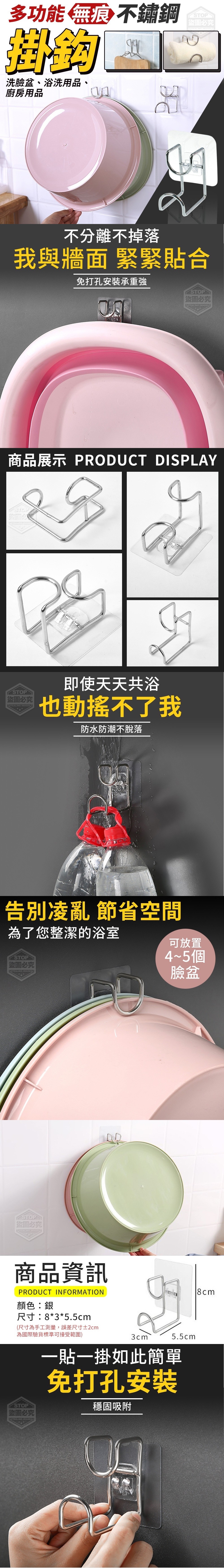 多功能無痕不銹鋼掛鈎(5入/包 MS社團價:1包60元 【商品尺寸】8*3*5.5cm (尺寸為手工測量,誤差尺寸±2cm為國際驗貨標準可接受範圍) 【商品說明】- 多功能無痕不銹鋼掛鈎 懸掛式安裝簡單無需打孔 可以掛洗臉盆、浴洗用品、廚房用品等 可作抺布、毛巾架,不佔用空間 告別凌亂、節省空間,給您最輕鬆的收納方案~ 免打孔安裝,穩固吸附不分離 不掉落與牆面緊緊貼合、防水防潮不脫落! .多功能 .無痕免鑽 .不鏽鋼更耐用