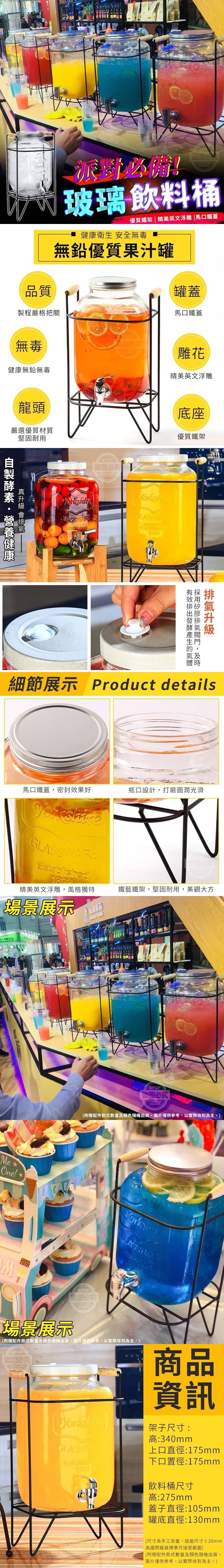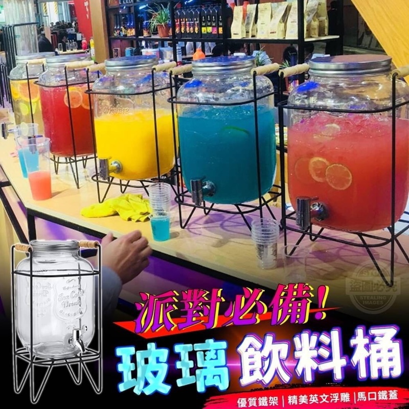 【商品說明】- 派對必備玻璃飲料桶 將製作好的飲口放入桶子裡放到鐵架上 就可以隨時邀請親朋好友開PARTY啦! 蓋子上的矽膠排氣孔 能及時有效排出發酵產生的氣體 讓您可以自己製做酵素來喝 使用無鉛優質材質 健康、安全、無毒 讓您安心盛裝飲料 精美的英文浮雕搭配鐵藝鐵架 二種搭起來創造了一種獨特的風格 家中、辦公、餐廳、夜店、 自助餐都很適合擺放喔! 美觀好看,實用又大方