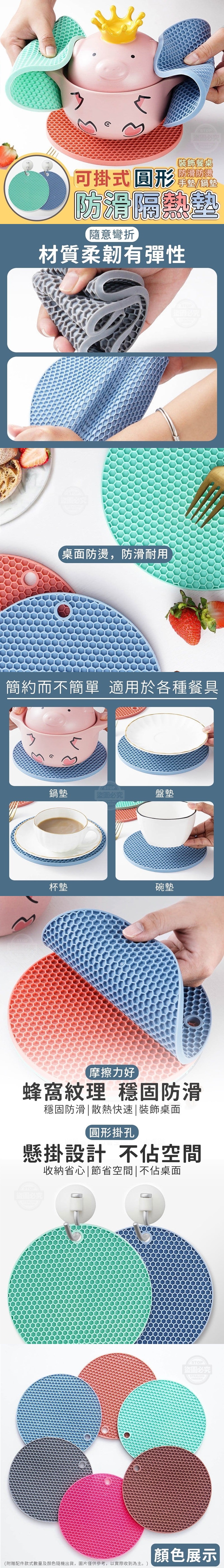 尺寸17.5cm 【商品顏色】-粉、藍、 綠、灰、咖啡、桃 (附贈配件款式數量及顏色隨機出貨, 圖片僅供參考,以實際收到為主。) 【商品說明】- 可掛式圓形防滑隔熱墊 蜂窩紋理結構摩擦力好 防滑又穩固,柔韌有彈性 隔熱性良好還能快速散熱 除了桌面墊子使用以外 還能當隔熱手墊使用喔! 防止燙手,可端熱熱的鍋子~ 隔熱墊上還有個圓形掛孔 不使用時可掛起來 不佔桌面,節省空間 收納不煩惱~ 多種繽紛的色彩 顏色柔和又舒適 就算不收起來 放在餐桌上也很好看 用色彩點綴您的居家空間