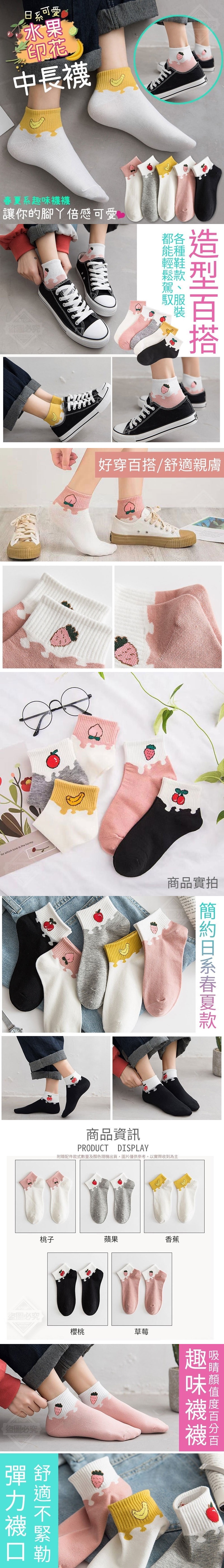 混裝 【商品款式】- 桃子、蘋果、 香蕉、櫻桃、草莓 (附贈配件款式數量及顏色隨機出貨, 圖片僅供參考,以實際收到為主。) 【商品說明】- 春夏系趣味襪襪 讓你的腳丫倍感可愛 吸睛顏值度百分百 各種鞋款、服裝 都能輕鬆駕馭! 用心做好襪,帶給你舒適體驗 彈力襪口 襪口採用優質編織、不勒腳、不鬆脫 耐磨腳跟 加固襪跟,減緩摩擦,貼服腳跟不易下滑 柔軟透氣 親膚透氣不悶熱,更貼心的呵護腳丫 男女皆可穿 豐富視覺營造休閒感 今夏時尚百搭款,一定要擁有