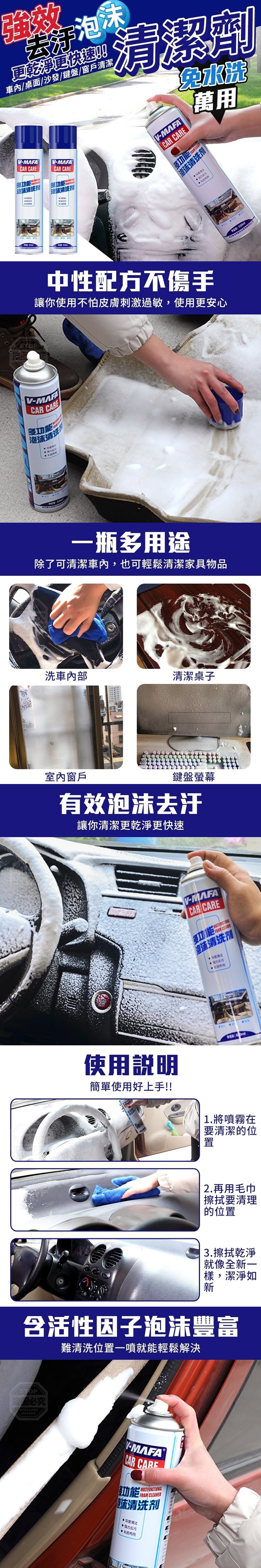 【商品說明】- 想清潔車內又不想弄得車裡溼答答的 那就用免水洗的泡沫清潔劑吧!! 有效泡沫去汙 讓你清潔更乾淨更快速 含活性因子泡沫豐富 難清洗位置一噴就能輕鬆解決 中性配方不傷手 讓你使用不怕皮膚刺激過敏, 使用更安心 一瓶多用 除了可清潔車內, 也可輕鬆清潔家具物品 讓你清潔更輕鬆方便!! 不再討厭打掃更便利!!