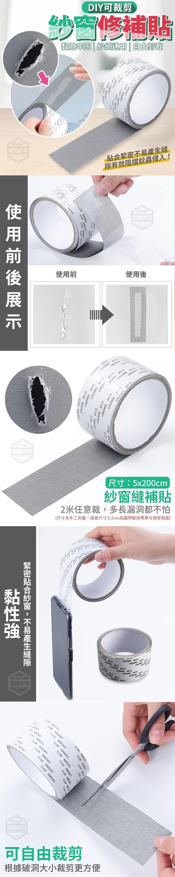 【商品尺寸】-5x200cm (尺寸為手工測量,誤差尺寸±2cm 為國際驗貨標準可接受範圍) 【商品說明】- DIY可裁剪紗窗修補貼 2米長度,可自由裁剪 根據破洞大小裁剪,多長破洞都不怕 黏性強、貼合緊密,很好的貼合紗窗 不易產生縫隙有效阻擋蚊蟲侵入! 修補貼網孔密集 孔眼小可阻擋大部分昆蟲進入 避免蚊蟲煩惱,同時保持空氣暢通 不用費力更換紗窗,讓生活寧靜舒適 ‧黏貼牢固 ‧紗網通用 ‧自由剪裁