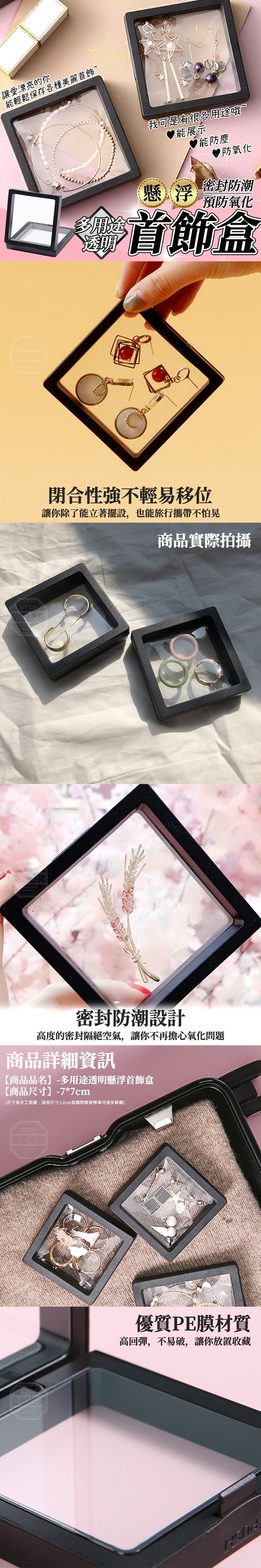 C 多用途透明懸浮首飾盒(10入 【商品尺寸】-7*7cm (尺寸為手工測量,誤差尺寸±2cm為國際驗貨標準可接受範圍) 【商品說明】- 有在收集首飾的你 常會遇到經時間會有灰塵氧化等問題 這時候有個首飾盒真的非常重要~ ✨密封防潮設計 高度的密封隔絕空氣,讓你不再擔心氧化問題 優質PE膜材質 高回彈,不易破,讓你能安心放置收藏 閉合性強不輕易移位 讓你除了能立著擺設,也能旅行攜帶不怕晃 不但能展示、能防塵防氧化~ 讓你輕鬆保存各種首飾~延長使用期限!!