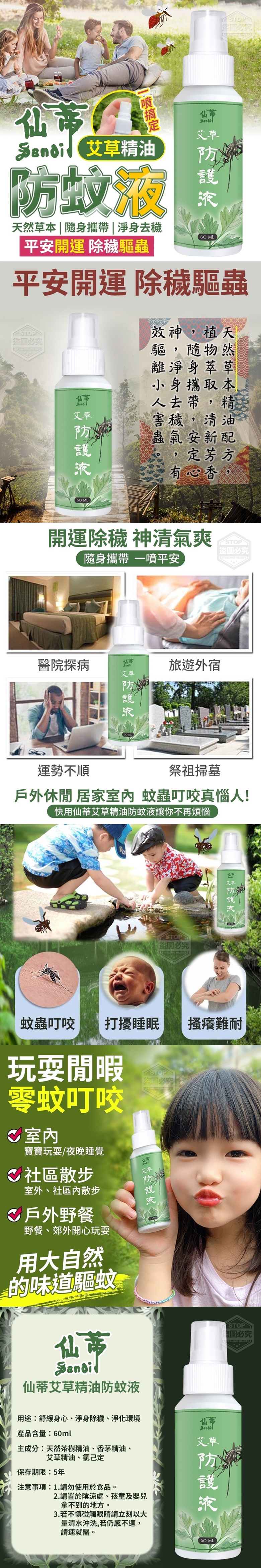 仙蒂艾草精油防蚊液 【商品容量】-60ml 【商品說明】- 蚊子又來!煩不煩阿! 你最近是否也深受其擾呢? 蚊子除了叮人和嗡嗡聲擾人清夢外 更是傳播病菌的推手... 如何遠離蚊子的騷擾? 艾草精油防蚊液就是答案~ 精選艾草、香茅與茶樹 3重打擊,讓蚊子無所遁形! 快用仙蒂艾草精油防蚊液輕鬆遠離蚊蟲! 多種用途 舒緩身心、淨身除穢、淨化環境、驅蚊防蚊 開運除穢 神清氣爽 隨身攜帶,一噴平安 嚴選天然草本 清新芳香 用大自然的味道來驅蚊最安心
