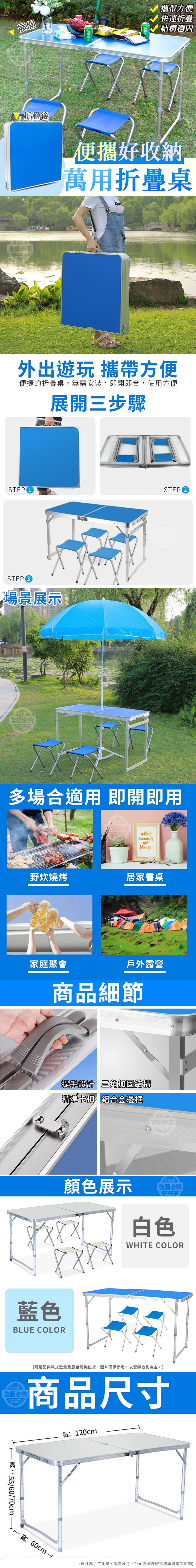 藍 白2色【商品尺寸】-長120x寬60x高55/60/70cm(尺寸為手工測量,誤差尺寸±2cm為國際驗貨標準可接受範圍)【商品顏色】-藍色、白色(附贈配件款式數量及顏色隨機出貨,圖片僅供參考,以實際收到為主。)【商品說明】-野炊燒烤、居家書桌、家庭聚會、戶外露營總會需要一張方便又大張的桌子這款超好用的萬用折疊桌可折疊起來方便你手提帶出們走到哪~帶到哪~攜帶超方便無需安裝,即開即合秒變桌子馬上使用鋁合金邊框搭配穩固三角結構設計堅固耐用,承重力強穩固放置,不易倒蹋,讓你使用超放心精準卡扣設計開合輕鬆又方便超大桌面,可放很多的東西野外露營和烤肉只需這張桌子就夠啦!