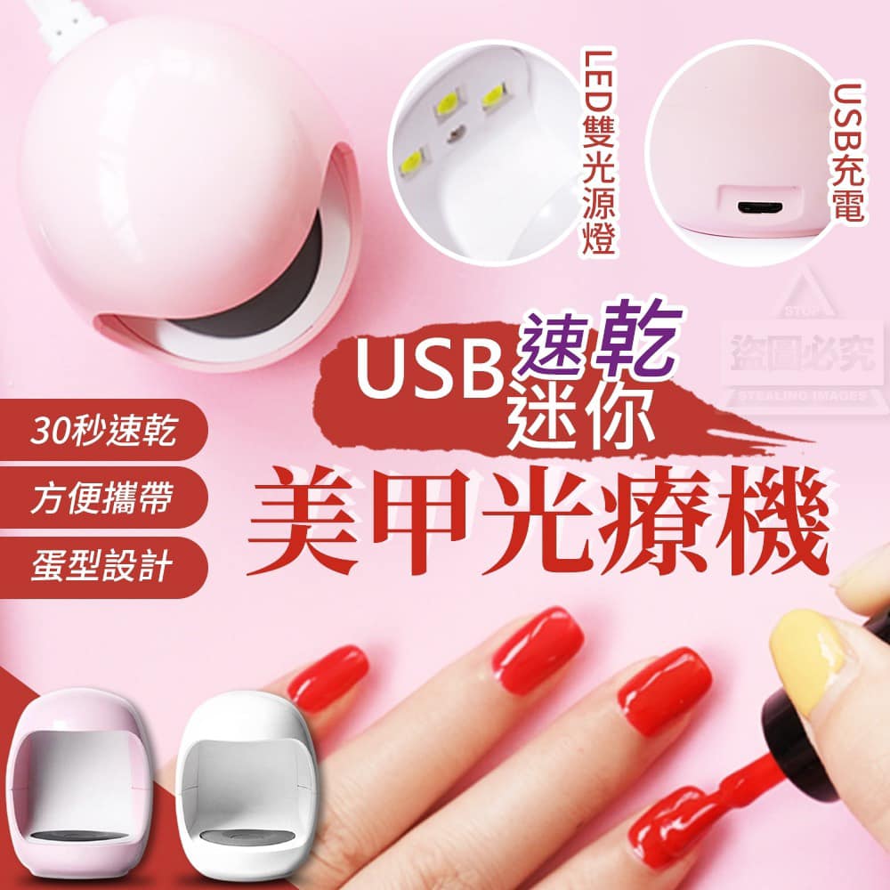 【商品款式】-白色/粉色(附贈配件款式數量及顏色隨機出貨,圖片僅供參考,以實際收到為主。)【商品尺寸】-58*45mm(尺寸為手工測量,誤差尺寸±20mm為國際驗貨標準可接受範圍)【商品說明】-世上只有懶女人,沒有醜女人懶得出門做美甲,懶得等指甲油乾迷你速乾美甲光療機實現您的願望USB充電接口設計讓你充電更便利,想到就充超方便30秒速乾不再擔心美甲未乾碰撞掉色速乾又能保持顏色飽滿!!舒適按鍵開關打造曲線舒適按鍵開關,使用更方便創新蛋型設計萌發內在少女心,輕鬆使用擁有好心情迷你好攜帶便利可攜帶,收納也不占空間LED雙光源燈設計讓光療指甲更速乾,效率高更方便~USB迷你速乾美甲光療機讓你隨時隨地都能享受美甲