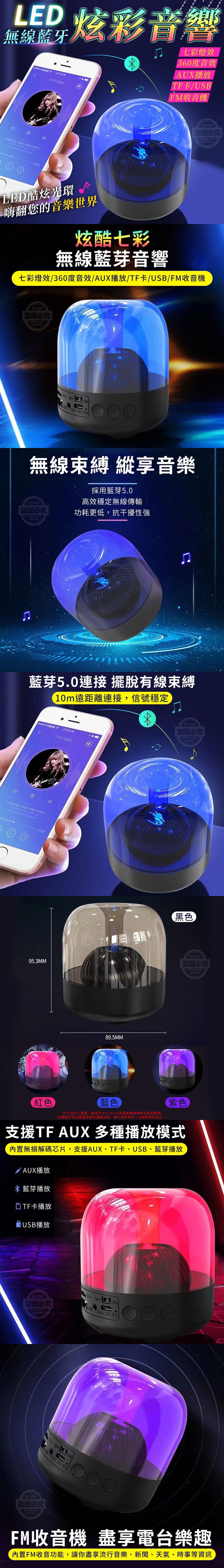 【商品尺寸】-95.3x89.5mm(尺寸為手工測量,誤差尺寸±20mm為國際驗貨標準可接受範圍)【商品顏色】-紅色、藍色、紫色、黑色(附贈配件款式數量及顏色隨機出貨,圖片僅供參考,以實際收到為主。)【商品說明】-LED炫彩無線藍牙音響搭載藍芽5.0連接技術高效穩定無線傳輸功耗更低,抗干擾性強讓您享受無線束縛,縱享音樂支援TF AUX內置無損解碼芯片支援AUX、TF卡、USB、藍芽播放等多種播放模式FM收音機內置FM收音功能讓你盡享流行音樂、新聞天氣、時事等資訊盡享電台樂趣藍芽5.010m遠距離連接,信號穩定擺脫有線束縛七彩燈效,LED酷炫光環嗨翻您的音樂世界