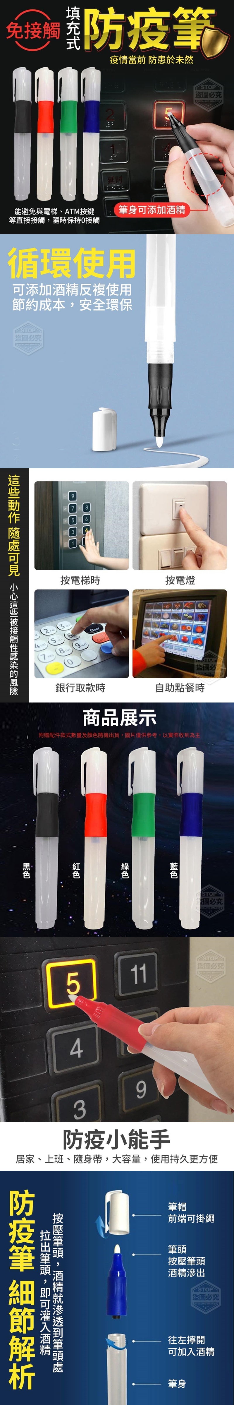 【商品顏色】黑色、紅色、綠色、藍色 (附贈配件款式數量及顏色隨機出貨, 圖片僅供參考,以實際收到為主。) 【商品說明】- 在疫情嚴峻的期間~ 按電梯、ATM按密碼、 按電燈開關、自助機點餐 小心這些動作容易有被接觸性感染的風險!! 疫情當前 防患於未然 ! 免接觸填充式防疫筆,筆身可添加酒精 不用直接接觸,取代你的小手! 防疫小能手 居家、上班、隨身帶, 大容量使用持久更方便 筆帽設計 可掛繩子或是插在口袋,攜帶方便 讓你0接觸,更安心!!