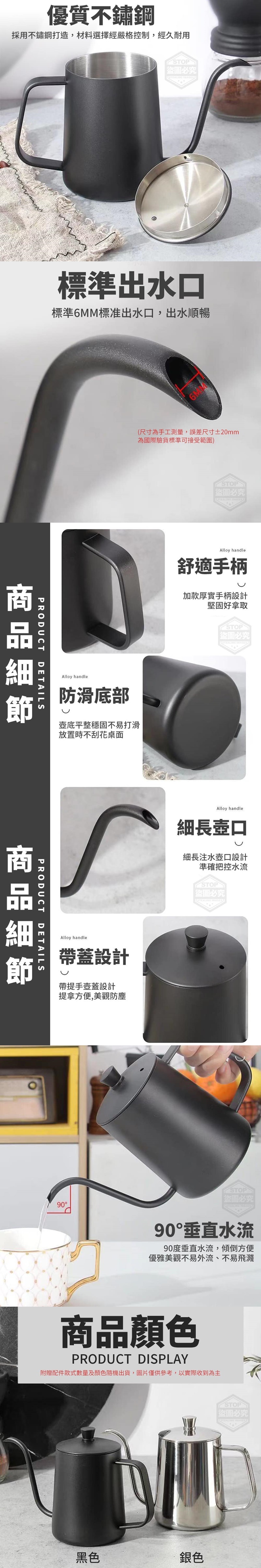 【商品材質】不鏽鋼 【商品顏色】黑色、銀色 (附贈配件款式數量及顏色隨機出貨, 圖片僅供參考,以實際收到為主。) 【商品說明】- 多用途不鏽鋼手沖咖啡壺,不鏽鋼打造 經久耐用,90度垂直水流, 傾倒方便,出水順暢, 優雅美觀不易外流、不易飛濺~ 細長壺口 細長注水壺口設計準確控管水流 帶蓋設計 帶提手壺蓋設計 提拿方便,美觀防塵 舒適手柄 加款厚實手柄設計 堅固好拿取 防滑底部 壺底平整穩固不易打滑 放置時不刮花桌面