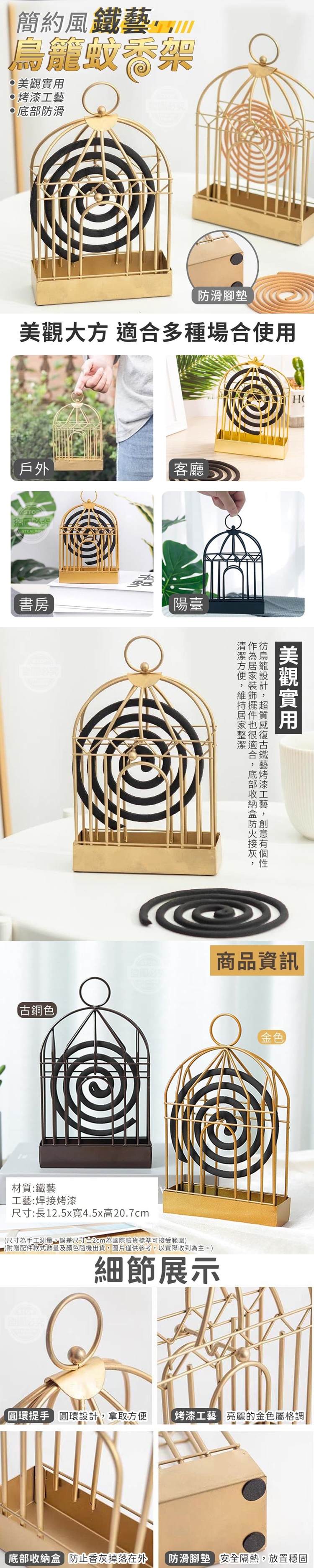 【商品材質】-鐵藝【商品尺寸】-長12.5x寬4.5x高20.7cm(尺寸為手工測量,誤差尺寸±2cm為國際驗貨標準可接受範圍)【商品顏色】-金色、古銅色(附贈配件款式數量及顏色隨機出貨,圖片僅供參考,以實際收到為主。)【商品說明】-簡約風鐵藝鳥籠蚊香架彷復古鳥籠設計搭配超質感鐵藝烤漆工藝創意有個性!作為居家裝飾擺件也很適合底部收納盒防火接灰清潔方便,維持居家整潔鐵藝烤漆工藝,懷舊復古質感簡約優美的線條,時尚有個性亮麗的金色充滿金屬格調底部收納盒,大容量的收納盒防止香灰掉落在外,方便你清理貼心的防滑腳墊配有防滑腳墊,安全隔熱放置穩固不易滑動小支架設計中間小支架可以支撐起蚊香圓環提手頂部圓環設計,拿取方便質感鐵架與眾不同擺在家中即為一道風景