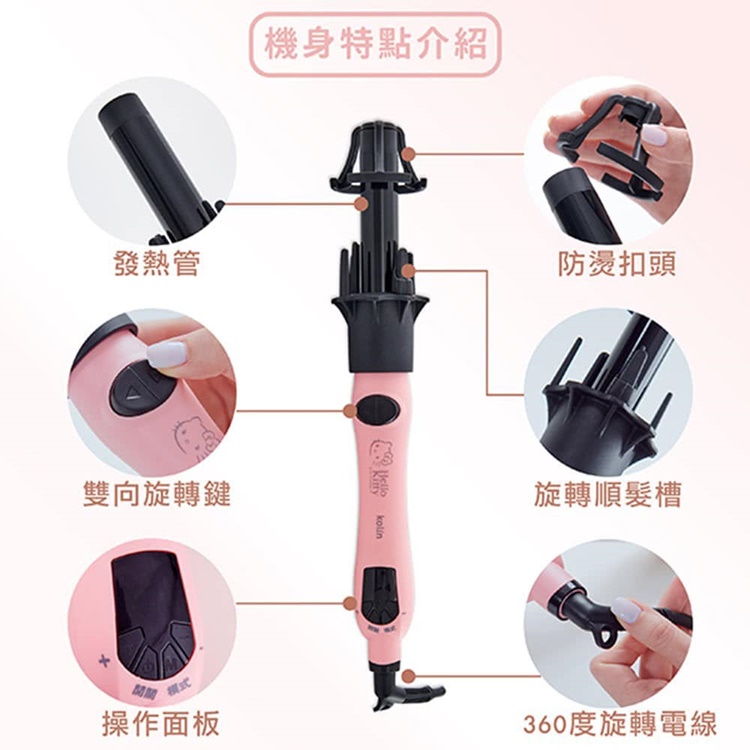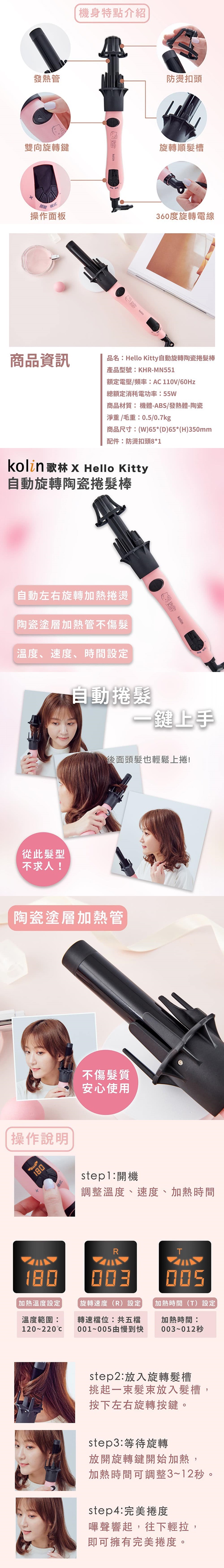 暢銷商品 歌林 Hello Kitty 自動旋轉陶瓷捲髮棒 (KHR-MN551 ) 歌林X Hello Kitty聯名款 自動左右旋轉加熱捲燙 陶瓷塗層加熱管不傷髮質 加熱溫度設定 旋轉速度設定 加熱時間設定 商品規格 額定電壓/頻率:AC110V/60Hz 消秏功率:55W 商品材質:機體-ABS /發熱體-陶瓷 產品配件:防燙扣頭*1 淨重/毛重: 0.5/0.7kg 商品尺寸:(W)65*(D)65*(H)350mm 包裝尺寸:(W)75*(D)120*(H)400mm 保固: 一年