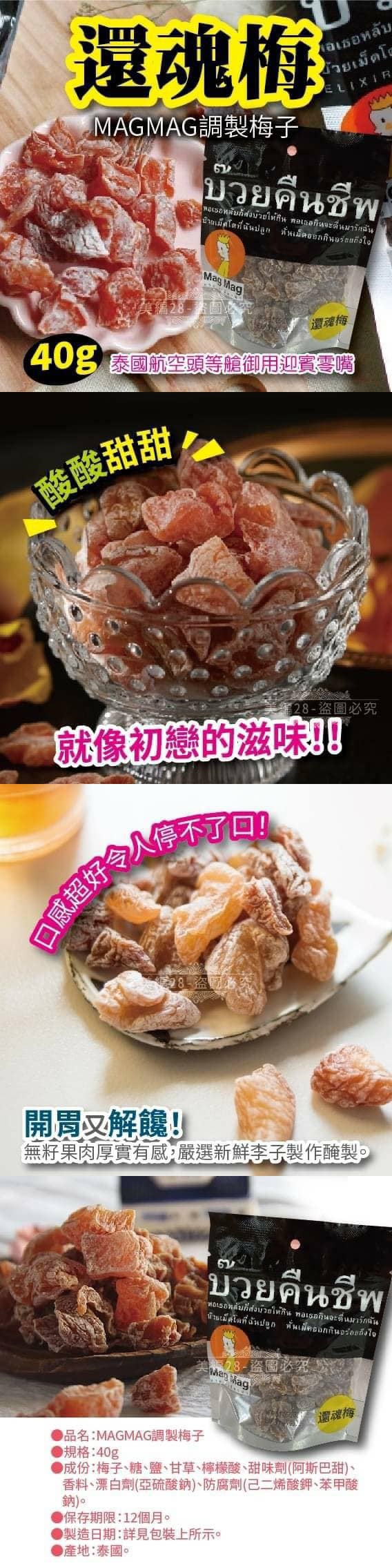 泰國航空頭等艙指定零食 還沒吃過泰國正夯的人氣還魂梅!? 酸酸甜甜的就像初戀的滋味, 開胃又解饞,無籽果肉厚實有感, 嚴選新鮮李子製作,先進工藝醃製, 將李子的精華完整封存, 保留了些許李子的果汁和纖維口感, 真的超好吃的!! 超好吃的梅子乾,酸酸甜甜的梅子果肉, 結合外層薄薄糖霜, 口感超好令人停不了口, 沒搭過頭等艙沒有關係, 但是頭等艙的高級零嘴你絕對不能錯過