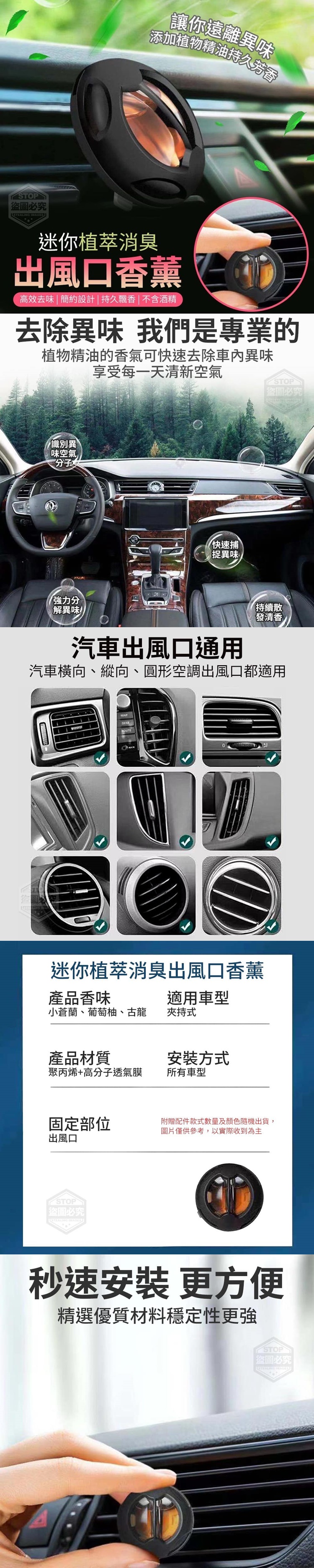 【商品材質】聚丙烯+高分子透氣膜 【商品尺寸】直徑537mm、夾長260mm (尺寸為手工測量, 誤差尺寸±20m為國際驗貨標準可接受範圍) 【商品香味】小蒼蘭、葡萄柚、古龍 【商品說明】- 夏天一進到車裡快窒息!!? 迷你植萃消臭出風口香薰 天然植萃配方,讓你遠離異味,有效除臭! 植物精油的香氣可快速去除車內異味 享受每一天的清新空氣~~ 迷你小巧 安裝簡單 通用多種車型風口 天然植萃配方 輕鬆享受植萃清香空氣 汽車出風口通用 汽車橫向、縱向、圓形空調出風口都適用