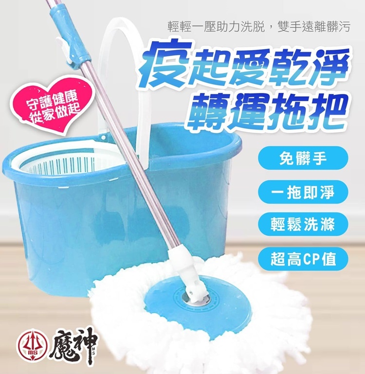 這組沒有小輪子和按壓罐 #守護健康 從家做起 一組配件:拖把杆x1支、脫水桶x1件、 塑膠籃1個、拖把布x2件個 如果你不喜歡雙手沾到水 不想去扭轉濕搭搭的拖把布 這款就是你最好的選擇 非買不可的理由如下 方便、快速、簡單、清潔 脫水原理設計,擁有強力清潔效果, 不髒您的玉手,不費體力, 操作簡單,一套成型, 大人小孩都上手,讓您能文雅的拖地。 新型拖把頭設計,可以360度任意旋轉, 均勻清潔,輕鬆深入任何角落。 獨特布條纖維,強力清潔, 耐磨抗菌, 不會刮傷各式地板或其他清潔面的精緻表面。