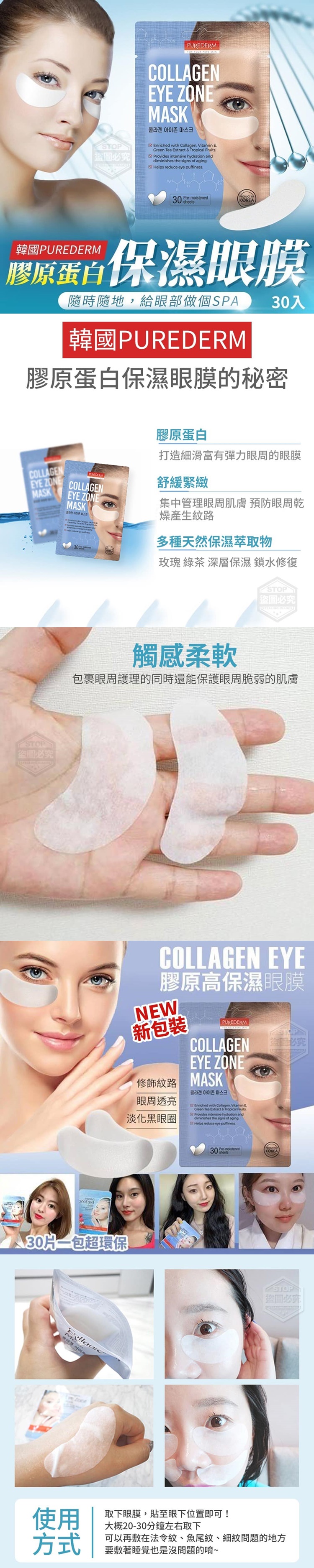 【商品說明】- 眼周皮膚不小心透漏年齡的秘密嗎? 眼周比其他皮膚更薄、更嬌嫩~ 所以更加需要好好保養! 眼妝和每天近兩萬次的眨眼 對眼角、眼尾、皮膚產生影響 容易有鬆弛下垂、眼窩 凹陷、細紋、黒眼圈等問題! 韓國PUREDERM膠原蛋白保濕眼膜 大容量30入,1包可敷15次 讓你隨時隨地,給眼部做個SPA! 膠原蛋白 打造細滑富有彈力眼周的眼膜 舒緩緊緻 集中管理眼周肌膚 預防眼周乾燥產生紋路 多種天然保濕萃取物 玫瑰 綠茶 深層保濕 鎖水修復