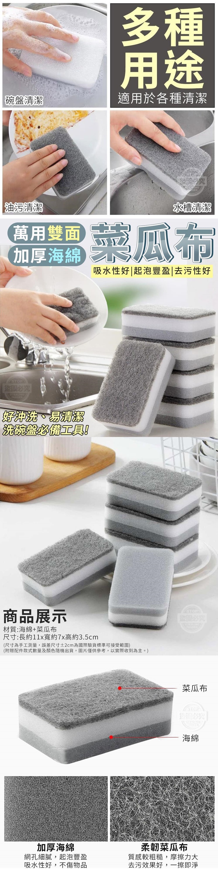 【商品材質】-海綿+菜瓜布 【商品尺寸】-尺寸:長約11x寬約7x高約3.5cm (尺寸為手工測量, 誤差尺寸±2cm為國際驗貨標準可接受範圍) 【商品說明】- 萬用雙面加厚海綿菜瓜布 加厚海綿,吸水性好 能夠產生豐盈的泡泡 去污效果非常好 是您洗碗盤必備工具! 雙面設計 使用方便,可根據不同需求使用 柔韌菜瓜布 質感較粗糙,摩擦力大 去污效果好,一擦即淨 加厚海綿 網孔細膩,起泡豐盈 吸水性好,不傷鍋具 好沖洗、易清潔 拿來洗碗盤、油污、水槽都可以 是您居家清潔的好幫手!