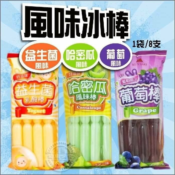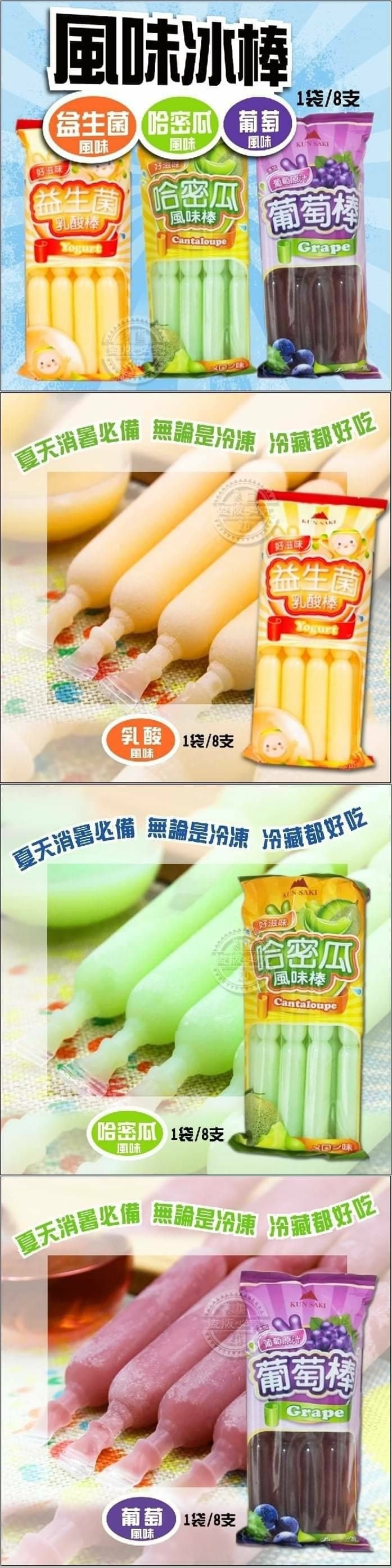 三種口味: 哈密瓜風味棒(純素) 葡萄風味棒(純素) 益生菌乳酸棒(奶素) 超熱銷超搶手,每次一來總是秒殺~~ 崑崎 果汁風味棒 多種超人氣果汁口味, 做成傳統冰棒的造型, 直接吃, 或是冷凍冷藏都很棒, 夏天來一包清涼消暑! 冰涼好滋味 淡熱夏天、清涼選擇