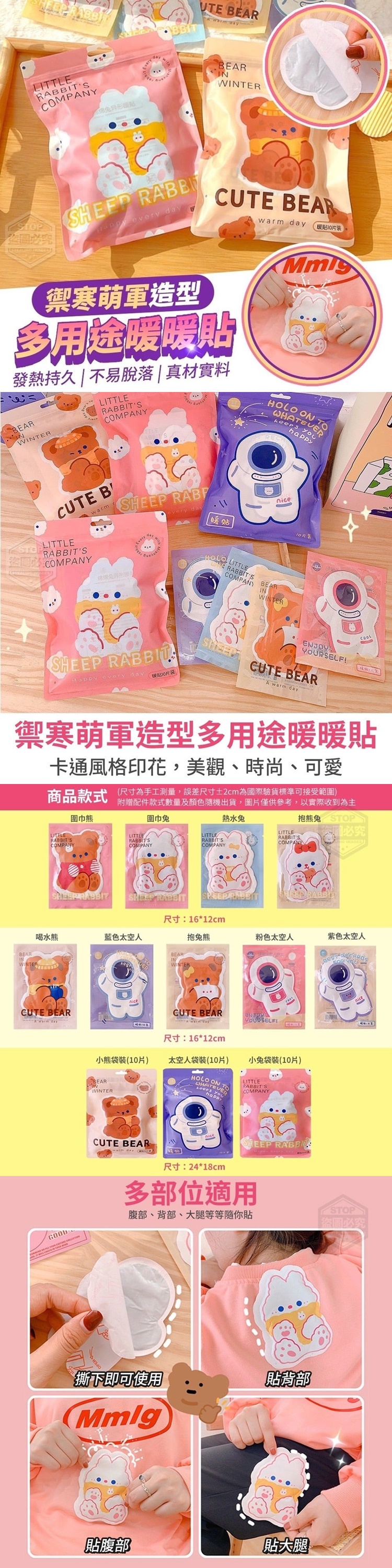 【商品顏色】-圍巾熊、圍巾兔、熱水兔、抱熊兔、喝水熊、藍色太空人、抱兔熊、粉色太空人、紫色太空人、小熊袋裝(10片)、太空人袋裝(10片)、小兔袋裝(10片)附贈配件款式數量及顏色隨機出貨,圖片僅供參考,以實際收到為主。【商品尺寸】-16*12cm