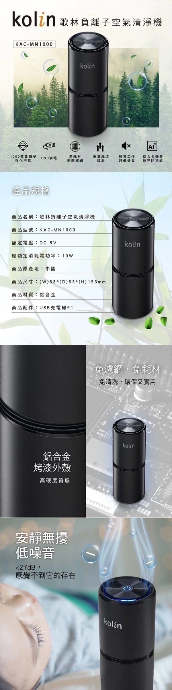 暢銷商品 【Kolin】歌林負離子空氣清淨機 (KAC-MN1000) 可產生約1,000萬高濃度負離子 可淨化空氣,消除異味、甲醛及抑菌 免濾網,免耗材,免清洗 單鍵開關,操作簡單 安靜無擾低噪音,小於27dB 垂直風道設計,有效促進負離子循環 體積輕巧,不佔空間 高硬度質感鋁合金烤漆外殼 USB供電,低功率,超省電 電壓:DC 5V 尺寸:(W)63*(D)63*(H)153mm 材質:鋁合金 配件:USB充電線*1