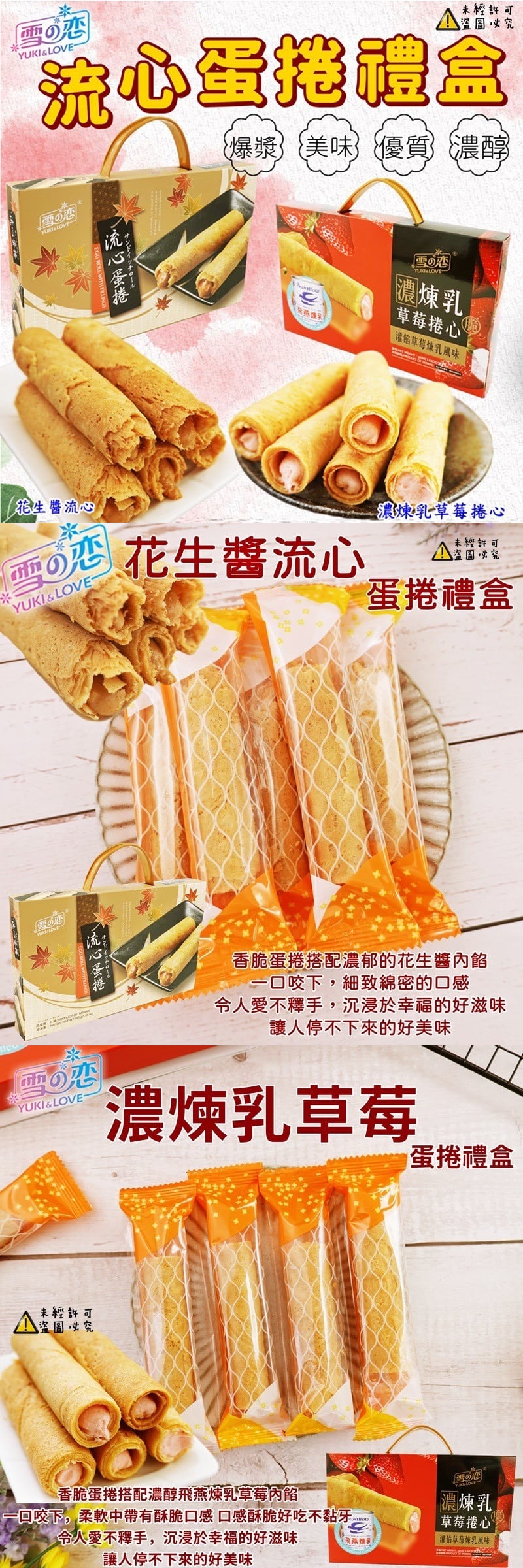 香脆蛋捲搭配濃郁的花生醬濃醇飛燕煉乳草莓內餡,一口咬下,柔軟中帶有酥脆口感,香氣十足,口感酥脆好吃不黏牙。獨立包裝,每口散發出幸福甜蜜的美味!適合外出旅遊、下午茶的最佳選擇,極致美妙融合,令人愛不釋手,沉浸於幸福的好滋味。(160g=8入) #蛋奶素實際出貨數量還是以重量為主唷