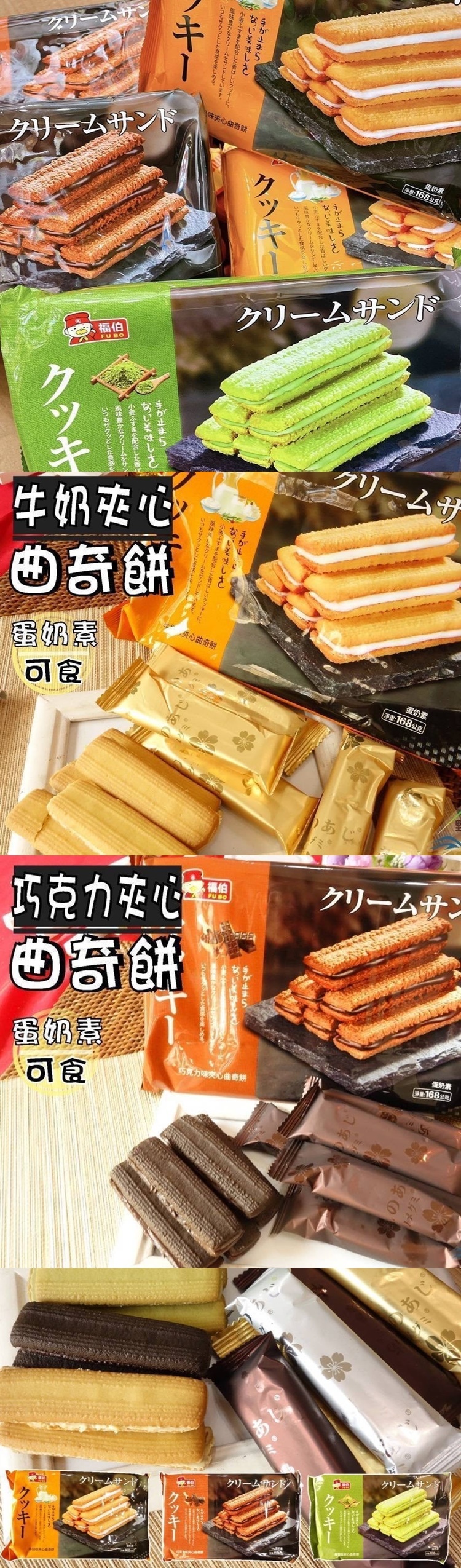 『福伯夾心曲奇餅』總算又到貨了, 每次一到貨總是瘋搶一空, 3種口味的曲奇餅加上牛奶夾心, 不管是原味、抹茶或是 最夯的巧克力口味都超唰嘴的, 總算知道由馬來西亞紅到全亞洲不是沒原因的, 好吃又超高CP值! 12入/包,168g/包,團購力量大, 年終慶買起來! 連續小包裝,乾淨又衛生, 隨身攜帶更方便。 保存期限: 365天