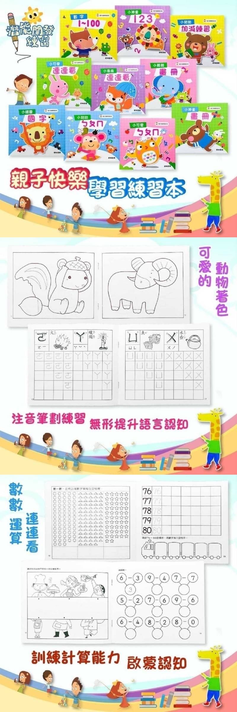 影片介紹 https://youtu.be/4ogE_0Hs9a4 數字1~100 小神童123 小精靈國字 小親親畫冊 小神童畫冊 小甜甜ㄅㄆㄇ 小可愛ㄅㄆㄇ 小可愛連連看 小乖乖連連看 小甜甜加減練習 多款潛能開發練習本, 讓孩子提早從樂趣中學習, 爸媽可與寶貝一起互動! 從數數、運算、國字、拼音、著色、 連連看都有,3~6歲都適用! 各項啟蒙認知訓練 幼兒手眼協調的運筆能力 根據幼兒興趣有效訓練孩子的大腦 拓展孩子的視野 規格:袋裝 / 16.8 x 18.8 cm / 普通級 / 全彩印刷
