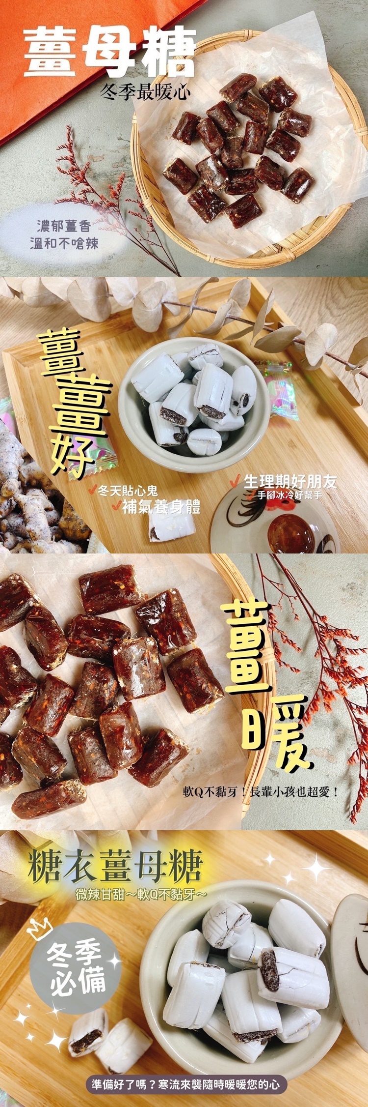 今年冬天剛好特別的冷 這時候來點軟Q甜甜的薑母糖 入口薑母的微辛辣感與麥芽的清甜 尾勁薑味夠 馬上讓您身體從裡到外~好暖好暖 而且看得到也吃得到一絲絲薑的纖維 完全真材實料超美味 獨立小包裝超方便攜帶 隨身來上一顆 滋補祛寒不黏牙 老人小孩也愛吃 還可以泡熱飲一起喝~ 薑母咖啡~薑母茶~薑母奶茶 團主們熱情分享各種泡法 真心推薦 喜歡甜一點的朋友可以選擇有糖衣的薑母糖 微辣甘甜 口感濃郁 越咬越有味道 讓吃得人心裡甜滋滋 產地:台灣 運費:成箱免運(限台灣本島)