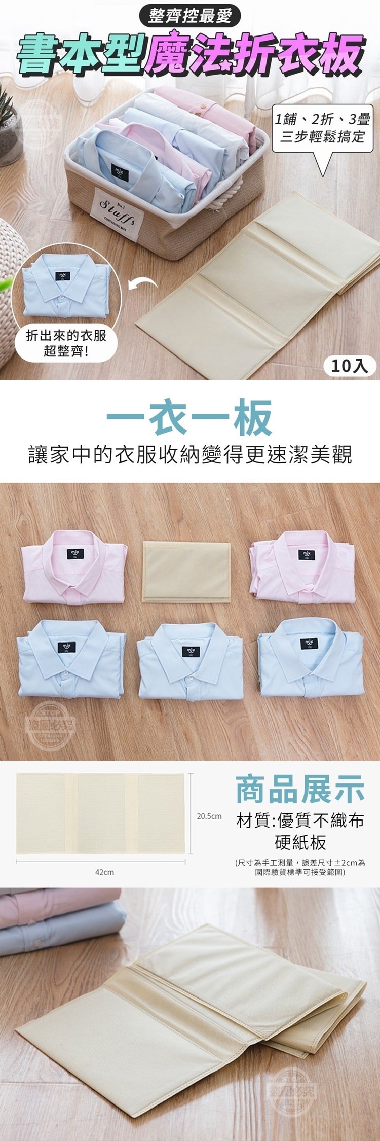 【商品材質】-優質不織布、硬紙板 【商品尺寸】-42x20.5cm (尺寸為手工測量, 誤差尺寸±2cm為國際驗貨標準可接受範圍) 【商品說明】- 衣服總是折得醜醜的 就算收納到抽屜櫃子一樣感很凌亂 來分享這款超級方便的 魔法折衣板 一鋪二折三疊,三步輕鬆搞定! 把衣物收得更整齊,還能輕鬆立起喔! 立體有型,可像書本立起擺放在抽屜裡 整整齊齊的,看了超舒適 拿取也很輕鬆喔! 用這個魔法折衣板 就連小朋友也能變成折衣大師 簡單、快速、省空間 不但能節省更多空間 拿取也更加方便