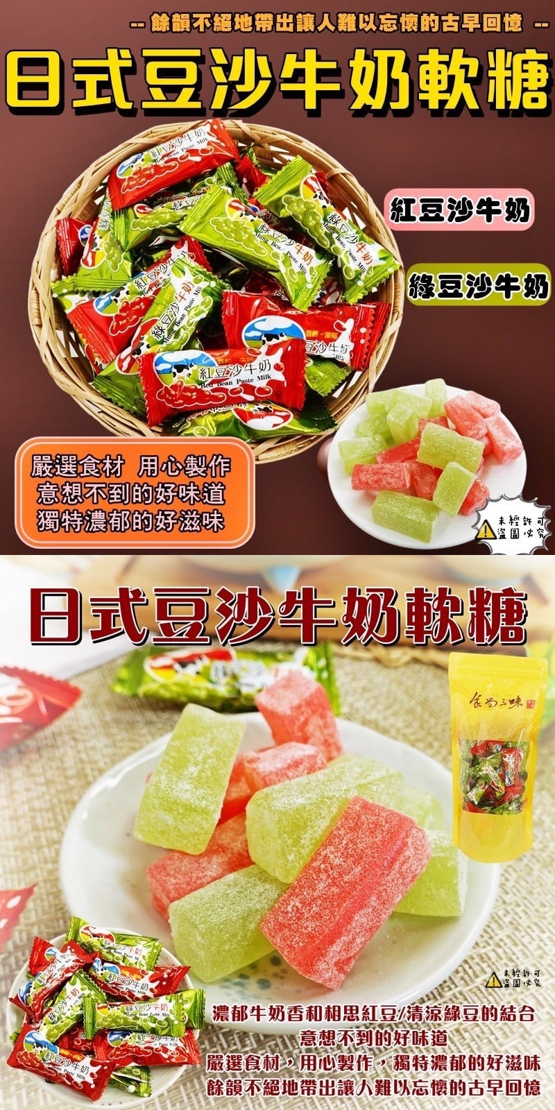 甜而不膩的幸福滋味 濃郁牛奶香和相思紅豆/清涼綠豆的結合, 意想不到的好味道!! 嚴選食材, 用心製作,獨特濃郁的好滋味, 口感佳!餘韻不絕地帶出 讓人難以忘懷的古早回憶。 (600g約90入) #奶素 實際出貨數量還是以重量為主唷 實品顏色跟照片會因燈光.顏色. 手機.電腦因素,難免有色差, 請以收到實品為主喔!! 保存方式:拆封後請盡快食用 避免高溫潮濕、陽光直射, 請放置於乾燥陰涼處所 產地: 台灣 賞味期限: 2022/12/10