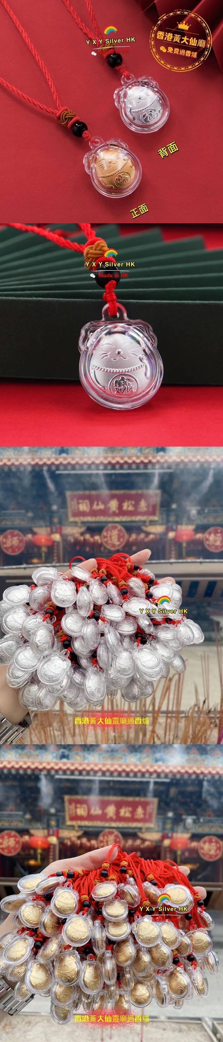 商品尺寸:吊墜高度;21.6mm 寬度;19.5mm 項鍊24吋內可以自由調節 商品材質:銀色是足銀999 金色是金箔 商品說明:香港百年歷史 有求必應的黃大仙靈廟過香爐[合十]祈福 招財進寶 福氣滿滿 招貴人 招好運保平安雙面都可以佩戴 一面刻字:招財進寶 另外一面刻字:福