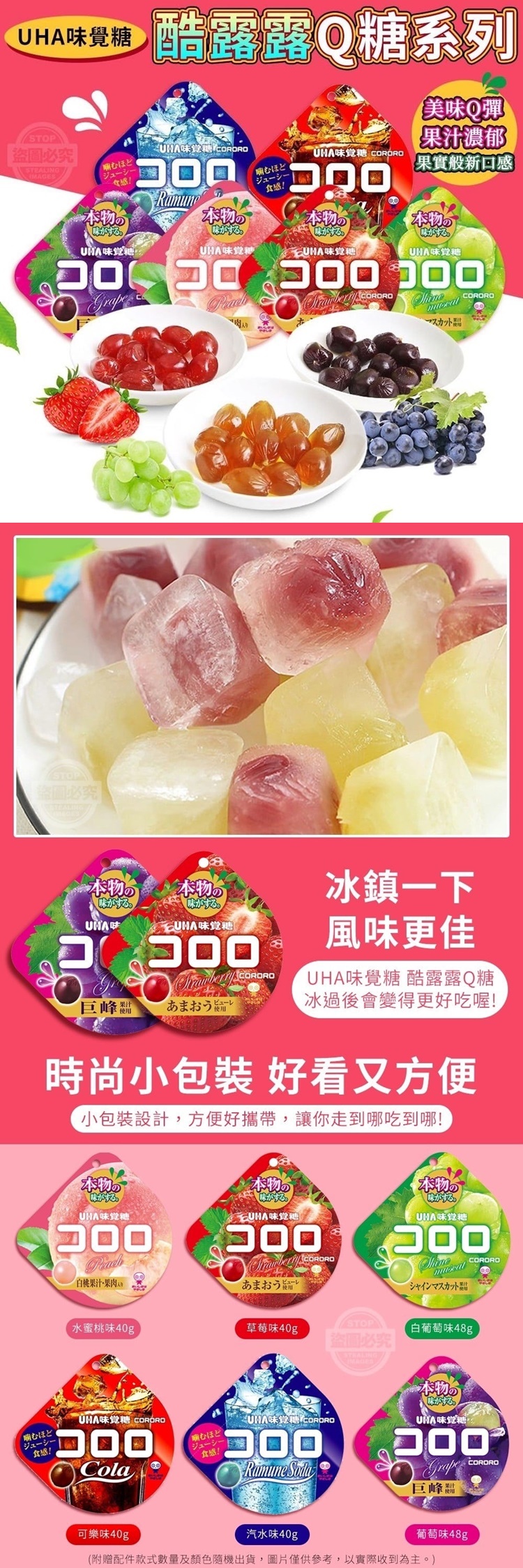 口味:水蜜桃味、草莓味、汽水味、可樂味重量:40g保存期限:12個月口味:葡萄味、白葡萄味