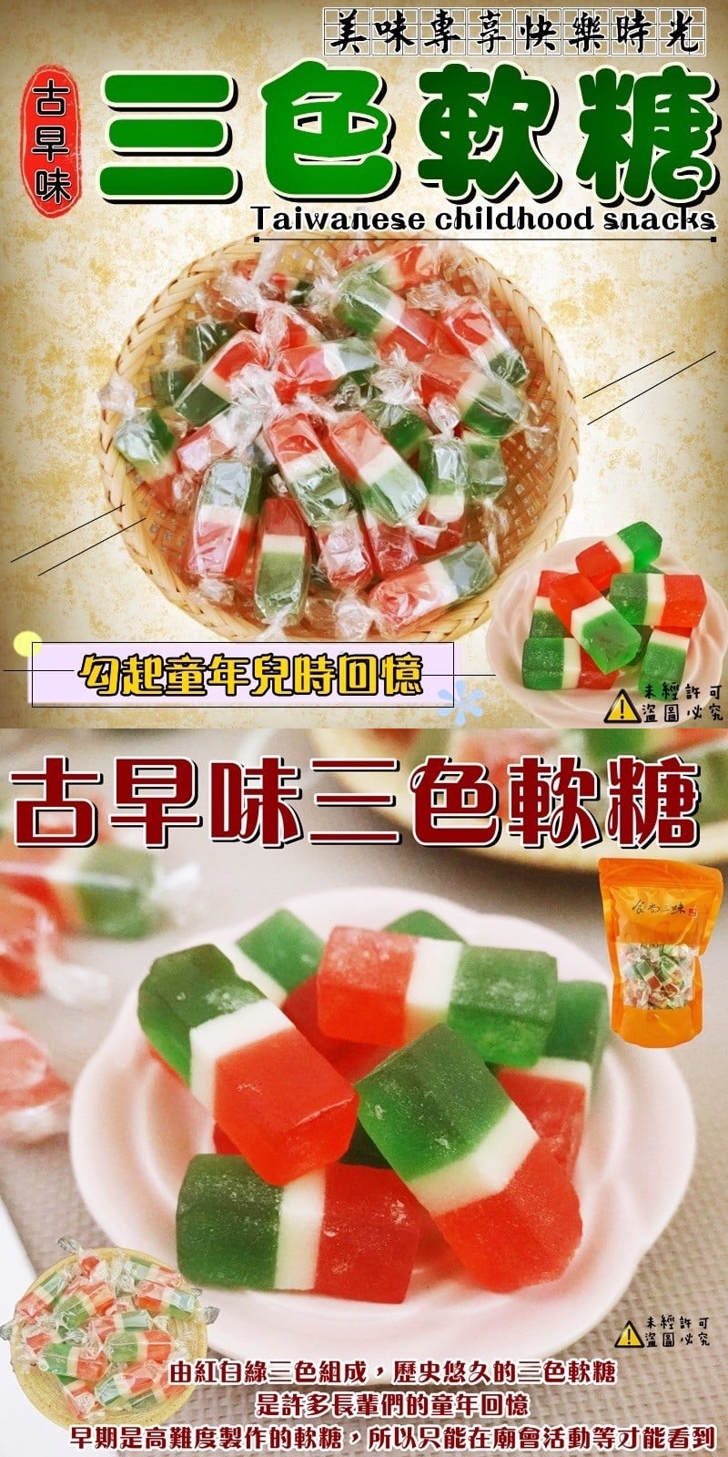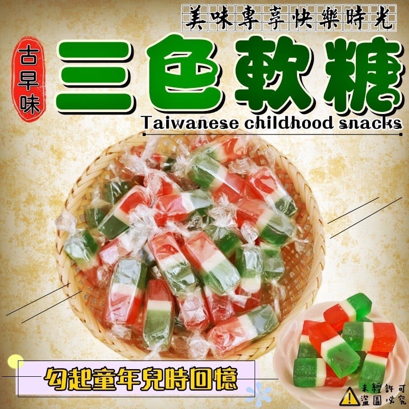 懷舊古早味 滿滿的幸福滋味 由紅白綠三色組成, 歷史悠久的三色軟糖, 是許多長輩們的童年回憶! 早期是高難度製作的軟糖, 所以只能在廟會活動等才能看到! #全素 (600g約60入) 實際出貨數量還是以重量為主唷 實品顏色跟照片會因燈光.顏色. 手機.電腦因素,難免有色差, 請以收到實品為主喔!! 保存方式:拆封後請盡快食用 避免高溫潮濕、陽光直射, 請放置於乾燥陰涼處所 產地: 台灣 賞味期限: 2023/03/19 效期會一直更新